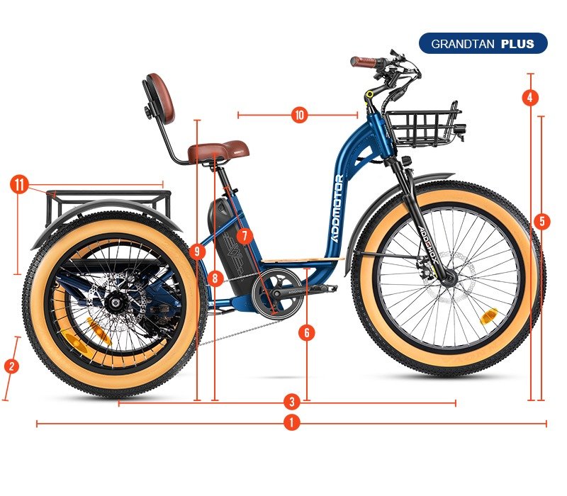 Comfort is at the heart of the Grandtan Plus M-340 eTrike. A wide padded saddle with adjustable backrest, torque sensor, and full suspension ensure smooth, enjoyable rides, while 7-speed gearing offers flexibility for different terrains. Mechanical disc brakes provide safe, responsive stopping power, and the integrated trailer tube expands its functionality for groceries, gear, or recreational use. For riders between 5′5″ and 6′5″, this three-wheel electric bike is not just transportation — it’s independence, convenience, and fun. If you’re looking for the best fat tire electric trike for adults, the Grandtan Plus M-340 is a reliable and stylish choice.
