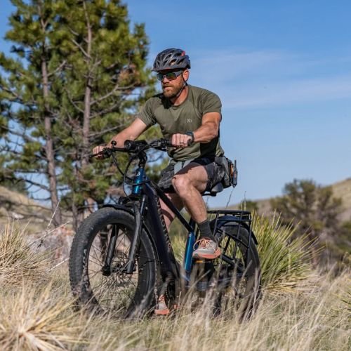 - Fat 26" x 4" tires add grip and stability across dirt, mud, sand, and snow.